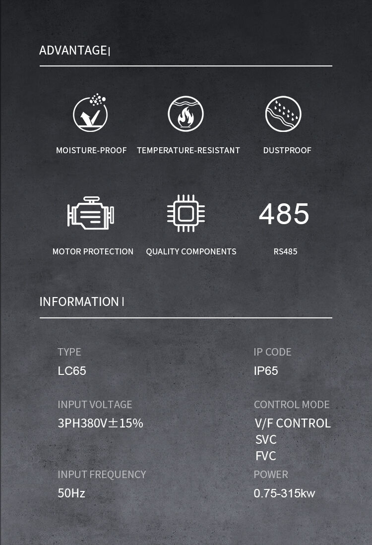 El convertidor de frecuencia de alto nivel de protección de la serie LC54 alcanza el nivel de protección IP54, y el PCB adopta un revestimiento UV de alto nivel de protección industrial para mejorar la resistencia. Especialmente diseñado para ambientes duros como alta corrosión, polvo alto, alta humedad, alta temperatura y contaminación pesada